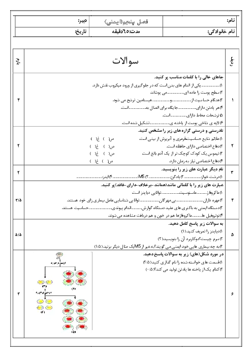 آزمون امتحانی درس زیست شناسی (2) | فصل پنجم: ایمنی پایه یازدهم