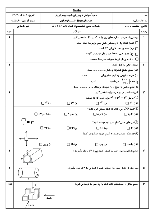 آزمون ریاضی هفتم از فصل های 6 تا 8 دبیرستان شیخ انصاری