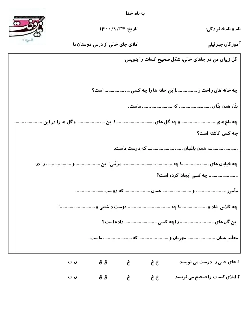 نمونه سوال امتحان کلاسی کتاب فارسی املای جای خالی درس 7: دوستان ما پایه دوم دبسنان همراه با پاسخنامه تشریحی