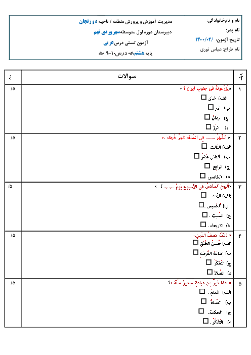 نمونه سوال امتحانی تستی عربی درس 9 و 10 پایه هشتم همراه با پاسخنامه کلیدی