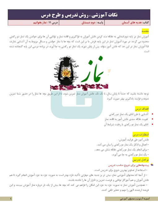 نکات آموزشی، روش تدریس و طرح درس هدیههای آسمانی دوم | درس 11: نماز بخوانیم