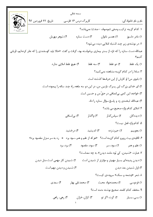 نمونه سوال امتحانی تستی درس فارسی | درس 16 پایه پنجم دبستان