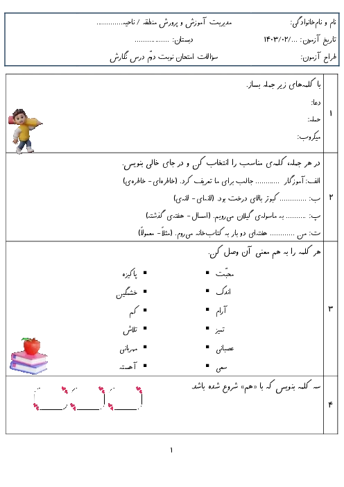 آزمون پایانی نگارش کلاس دوم دبستان دبستان سید شریف حسینی در اردیبهشت 1403