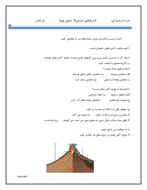 نمونه سوال امتحان کلاسی درس علوم تجربی درس 5: زمین پویا پایه ششم همراه با پاسخنامه کلیدی
