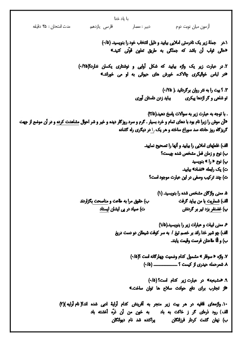 آزمون مستمر درس فارسی فصل 5 و 6 پایه یازدهم دبیرستان