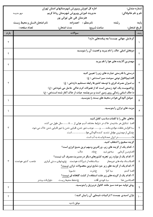 نمونه سوالات دی ماه کتاب انسان و محیط زیست هنرستان فنی نورانی پور