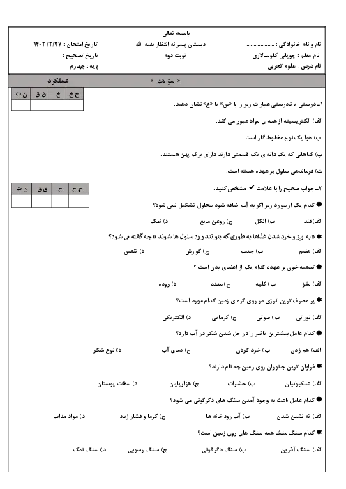 آزمون نوبت دوم اردیبهشت 1402 | علوم تجربی چهارم دبستان انتظار بقیه الله