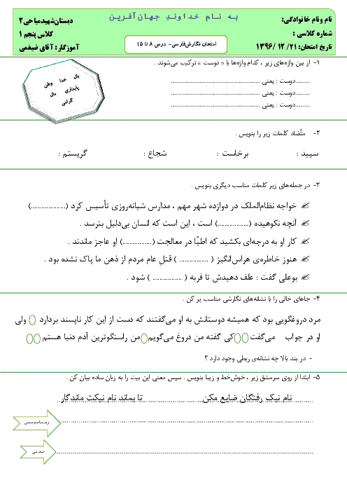 آزمون فارسی پنجم دبستان شهید میاحی باوی | درس های 8 تا 15