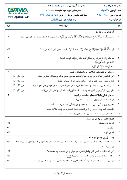نمونه سوال امتحان نوبت اول دین و زندگی (3) دوازدهم رشته انسانی | سری 1