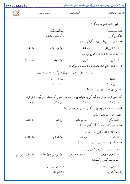 نمونه سوال امتحانی تستی درس فارسی | درس هفدهم: مثلِ دانشمندان پایه دوم ابتدایی