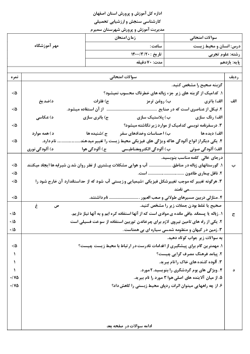 سوالات آزمون نوبت دوم انسان و محیط زیست یازدهم دبیرستان شهدای وردشت | خرداد 1400