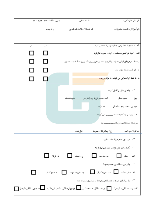 آزمون مطالعات اجتماعی پنجم دبستان علامه طباطبایی | فصل 4: زیارت مکانهای مقدس (درس 15 تا 18)