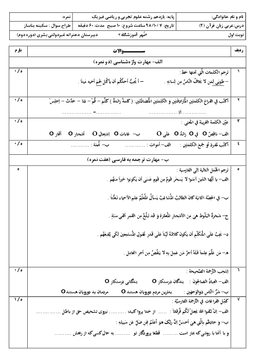 آزمون نوبت اول عربی (2) یازدهم دبیرستان دخترانه غیردولتی بشری | دی 98