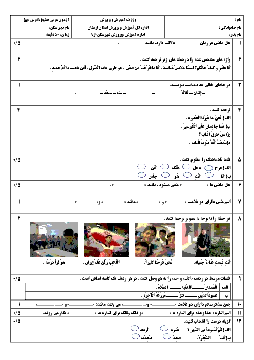 نمونه سوال امتحانی مستمر اسفند درس عربی درس 1 تا 8 پایه هفتم