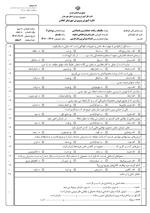 نمونه سوال امتحان پودمان 3: طراحی کسب و کار | درس کارگاه نوآوری و کارآفرینی هنرستان غیرانتفاعی دماوند