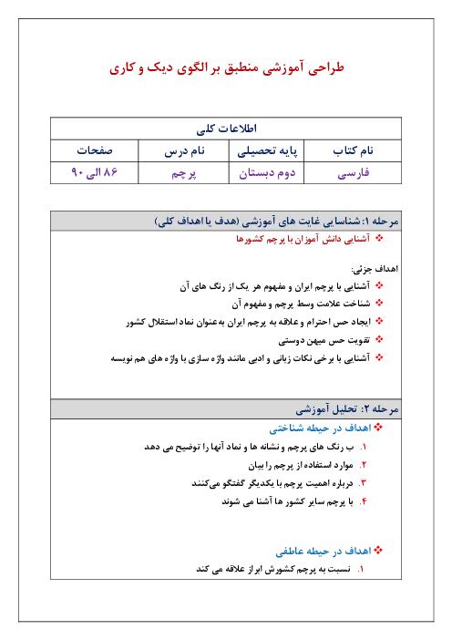 شیوه تدریس و طرح درس روزانه کتاب فارسی درس 14: پرچم پایه دوم منطبق بر الگوی دیک و کاری |