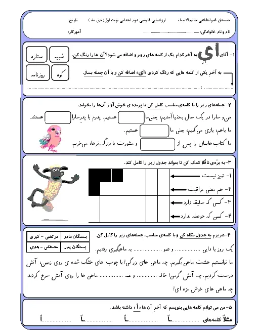 ارزشیابی نوبت اول فارسی کلاس دوم دبستان خاتم الانبیاء | درس 1 تا 7