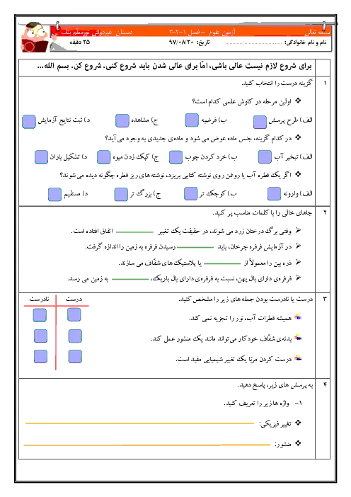 آزمون ارزشیابی مستمر درس علوم تجربی درس 1 تا 3 پایه پنجم دبستان