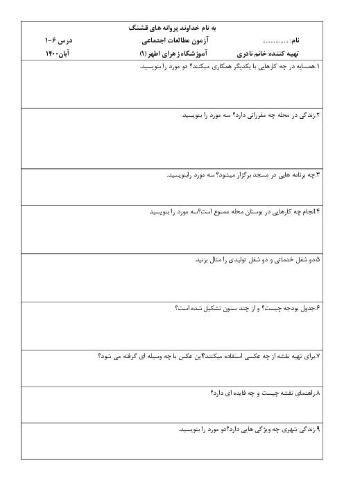 آزمون دورهای مطالعات اجتماعی چهارم دبستان زهرای اطهر 1 | درس 1 تا 6