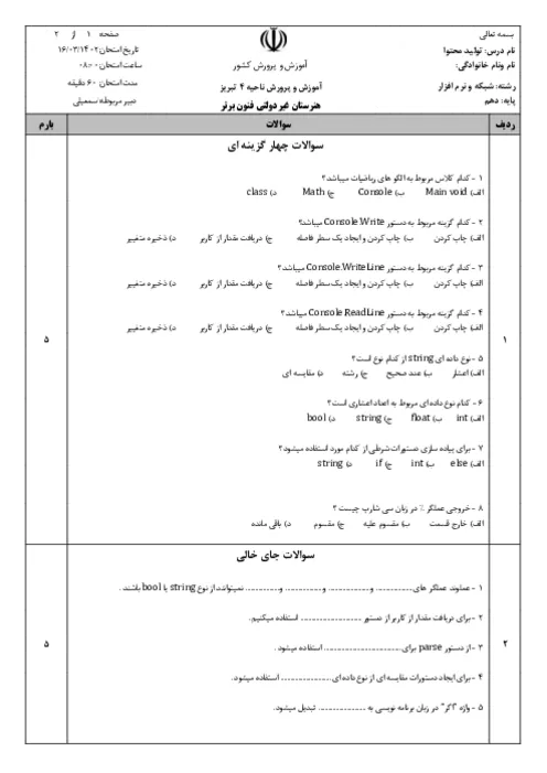 هشت سوال تستی : پنج نمره