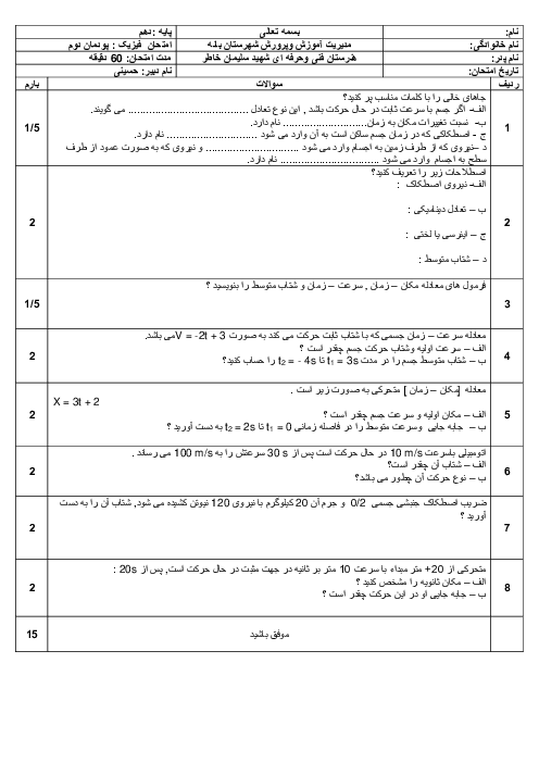 آزمون فیزیک دهم فنی هنرستان شهید سلیمان خاطر | فصل 2: مکانیک