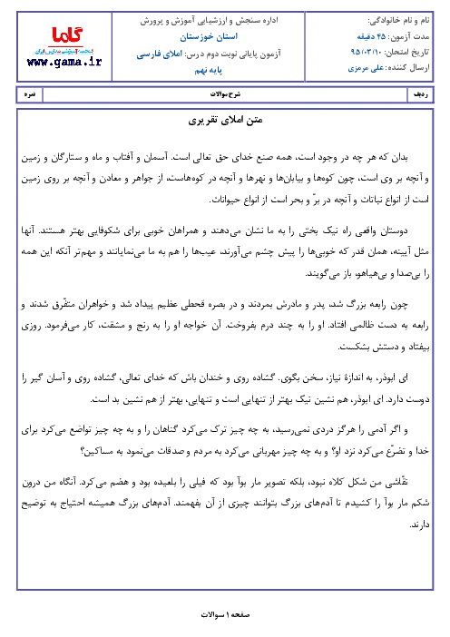 سوالات امتحان هماهنگ استانی نوبت دوم خرداد ماه 95 درس املا فارسي پايه نهم | استان خوزستان