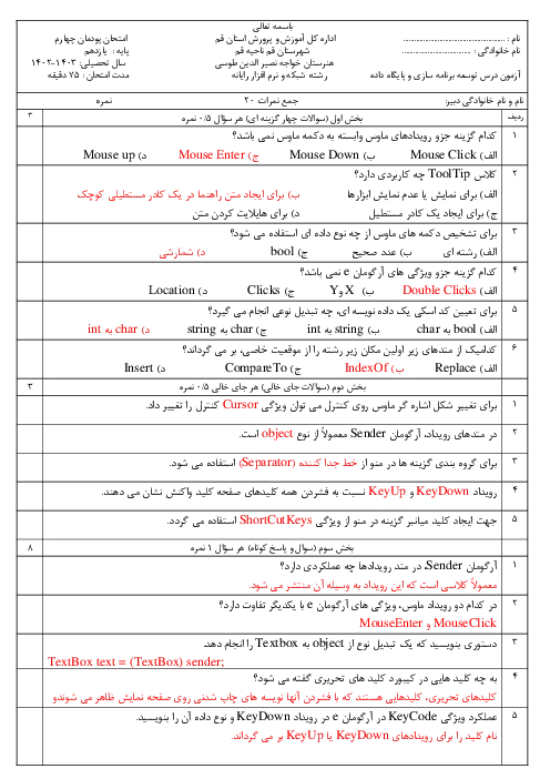 نمونه سوال امتحانی درس توسعه برنامه سازی و پایگاه داده پودمان 4: توسعه واسط گرافیکی همراه با پاسخنامه تشریحیکاربری