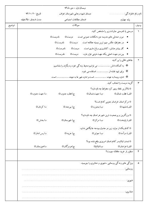 نمونه سوال امتحانی ترم اول دی 96 درس مطالعات اجتماعی : فصل 1 تا 6 پایه چهارم دبستان