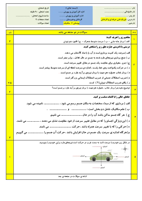 نمونه سوال امتحانی پودمانی درس فیزیک فنی فصل 2: مکانیک پایه یازدهم هنرستان همراه با پاسخنامه تشریحی