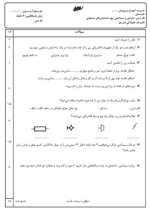 در این نمونه سوال از مطالب تئوری درس طراحی و سیم کشی برق ساختمان های مسکونی سوال طرح شده است.