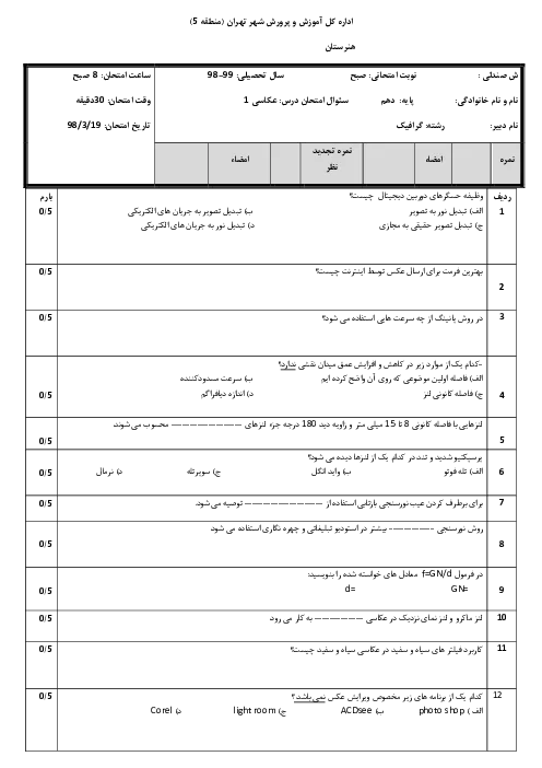 نمونه سوال امتحانی ترم دوم | خرداد 1399 درس عکاسی (1) پایه دهم