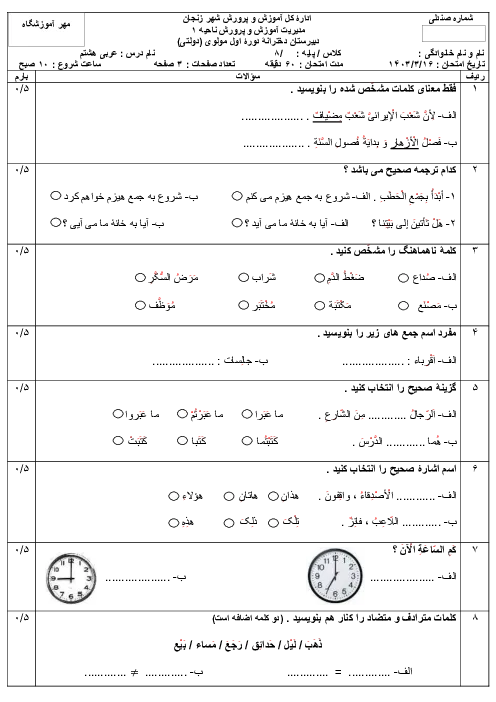 سوالات نوبت دوم عربی هشتم خرداد 1403 مدرسه دخترانه مولوی