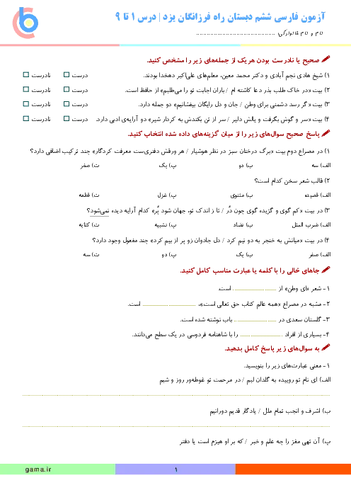 آزمون فارسی ششم دبستان راه فرزانگان یزد | درس 1 تا 9