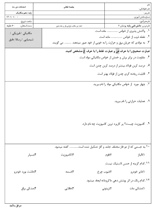 نمونه سوال امتحانی دانش فنی پایه | پودمان 3: کاربرد مواد در خودرو رشته مکانیک خودرو پایه دهم همراه با پاسخنامه تشریحی