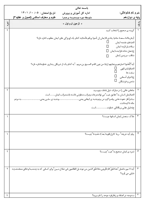 نمونه سوال امتحانی ترم اول دی 1401 اصول عقاید (3)پایه دوازدهم دبیرستان
