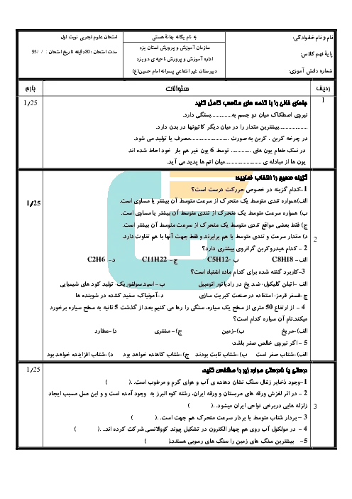 نمونه سوال امتحانی علوم تجربی نوبت اول دی 95 پایه نهم دبیرستان