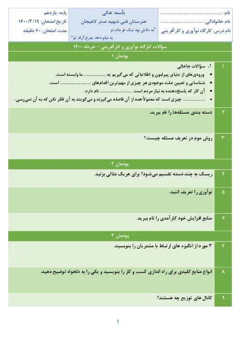 سوالات آزمون نوبت دوم کارگاه نوآوری و کارآفرینی یازدهم هنرستان شهید صدر لاهیجان | خرداد 1400