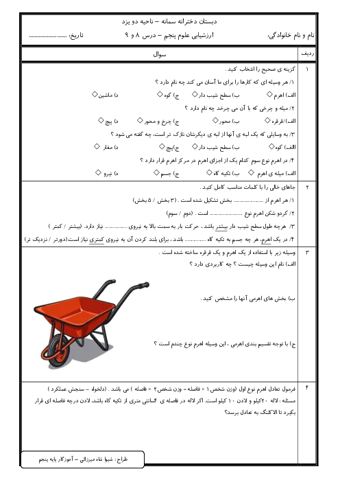شامل سوالات چهار گزینه ای ، تکمیل جای خالی ،تشخیص نوع اهرم و کاربر آن ، ارزشیابی یک فعالیت علوم از کتاب درسی ،5 مورد سوال تشریحی ، یک سوال مهارت محور (متن یک مشکل کوچک و تشخیص ماشین مورد استفاده برای رفع آن مشکل ) طرح شده است .