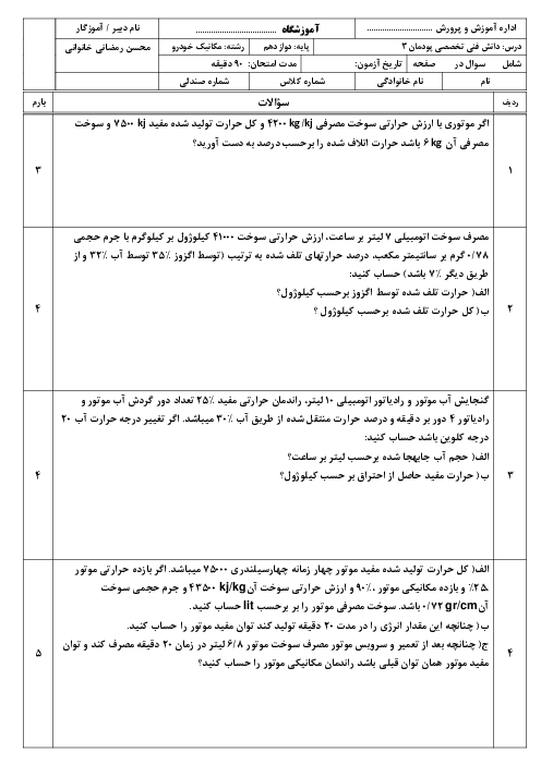 امتحان پودمان سوم: محاسبات کاربردی خودرو | درس دانش فنی تخصصی رشته مکانیک خودرو
