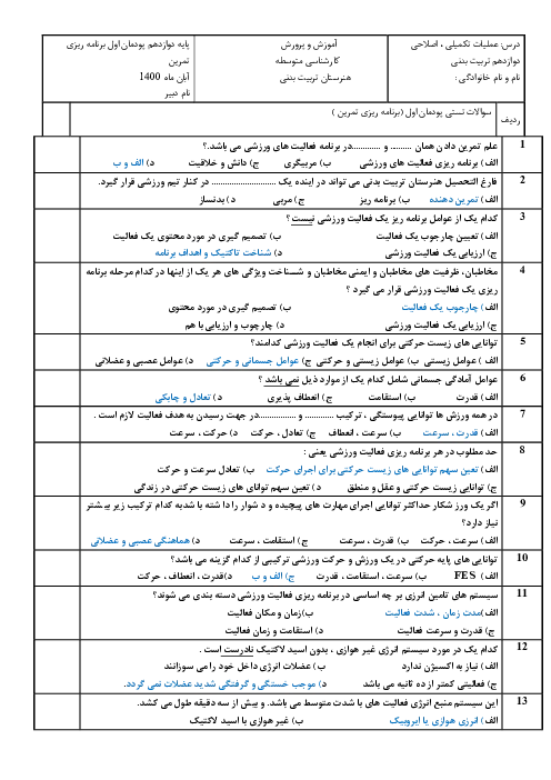 نمونه سوال امتحانی تستی عملیات تکمیلی- اصلاحی ورزشها | پودمان 1: برنامه ریزی تمرین پایه دوازدهم همراه با پاسخنامه کلیدی