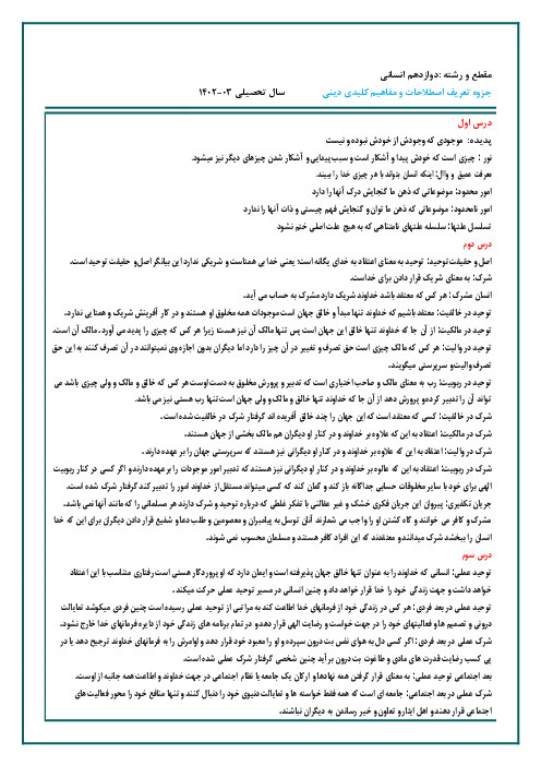 جزوه تعریف اصطلاحات و مفاهیم کلیدی دینی دوازدهم انسانی