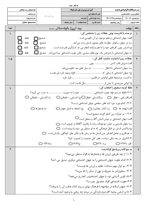 سوالات آزمون نوبت دوم جامعه شناسی (1) دهم دبیرستان فاطمه الزهرا (س) | اردیبهشت 1401