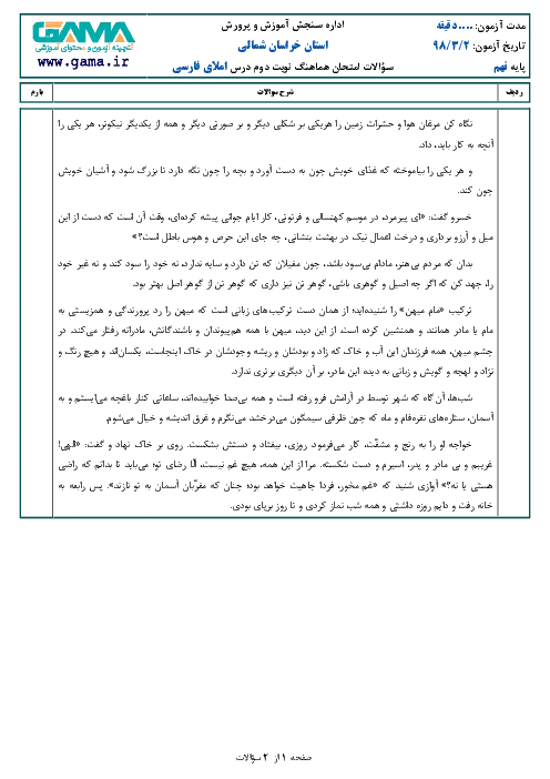 امتحان هماهنگ استانی نوبت دوم املا و انشای فارسی پایه نهم استان خراسان شمالی | خرداد 1398