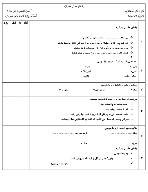 نمونه سوال امتحانی درس فارسی درس 8 و 9 پایه دوم دبستان
