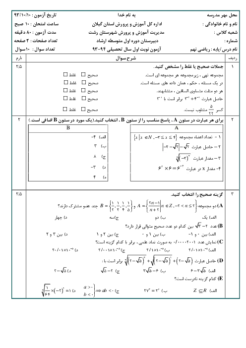 6 سری آزمون نوبت اول ریاضی نهم مدرسه غیردولتی ارشاد رشت | دی93 تا دی98
