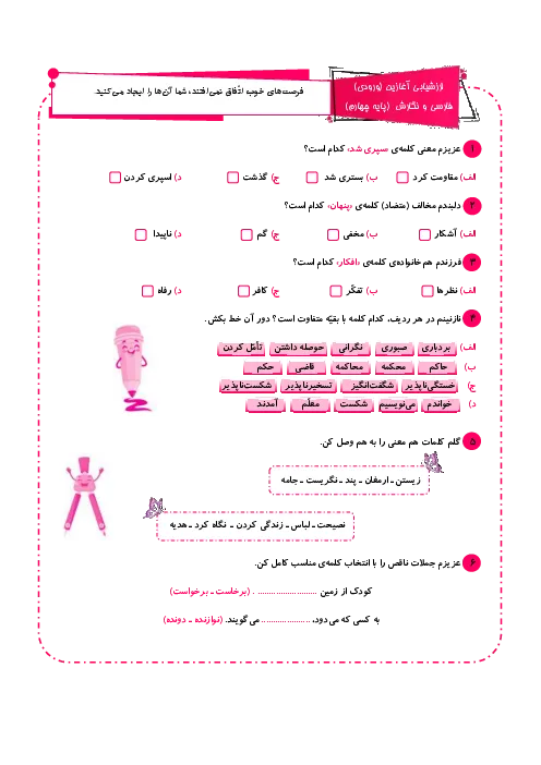 ارشیابی آغازین یا ورودی درس فارسی برای آمادگی پایه پنجم (سوالات فارسی از پایه چهارم) با انواع سوالات متنوع و کاربردی