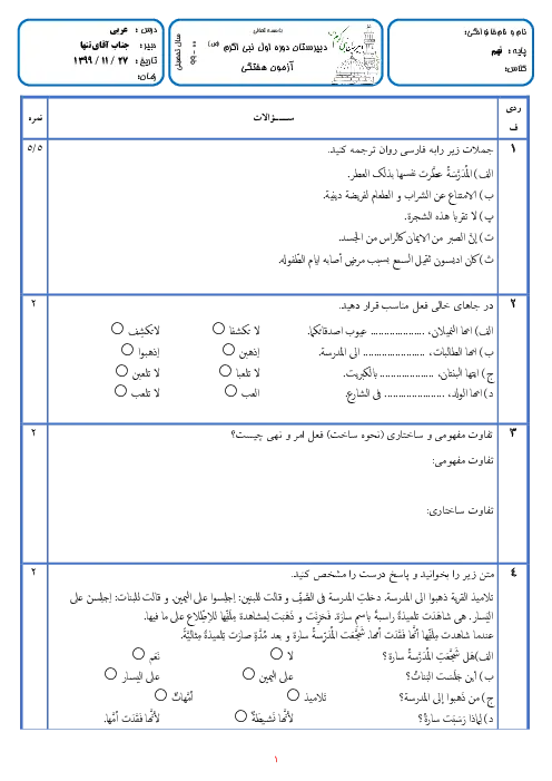 آزمون عربی نهم مدرسه نبی اکرم تهران | درس 6 و 7
