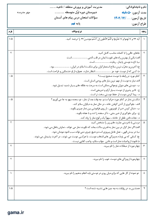 این سوالات از درس های 7تا 9 پیام های آسمان طراحی شده است و هدف از آن ارزشیابی آموخته های دانش آموزان بوده است .