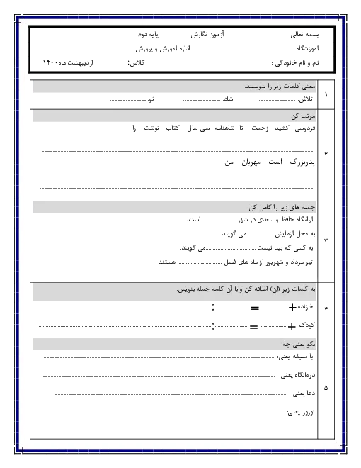 نمونه سوال امتحانی ترم دوم اردیبهشت 1400 درس نگارش پایه دوم دبستان