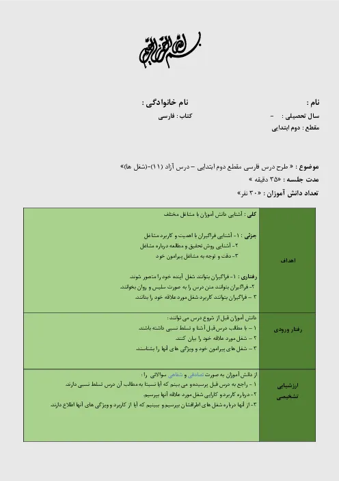طرح درس روزانه کتاب درسی فارسی پایه دوم دبستان | درس 11: درس آزاد (آشنایی با شغل ها)